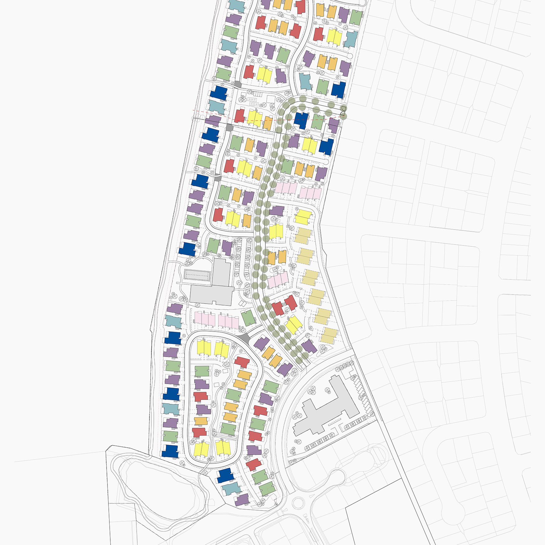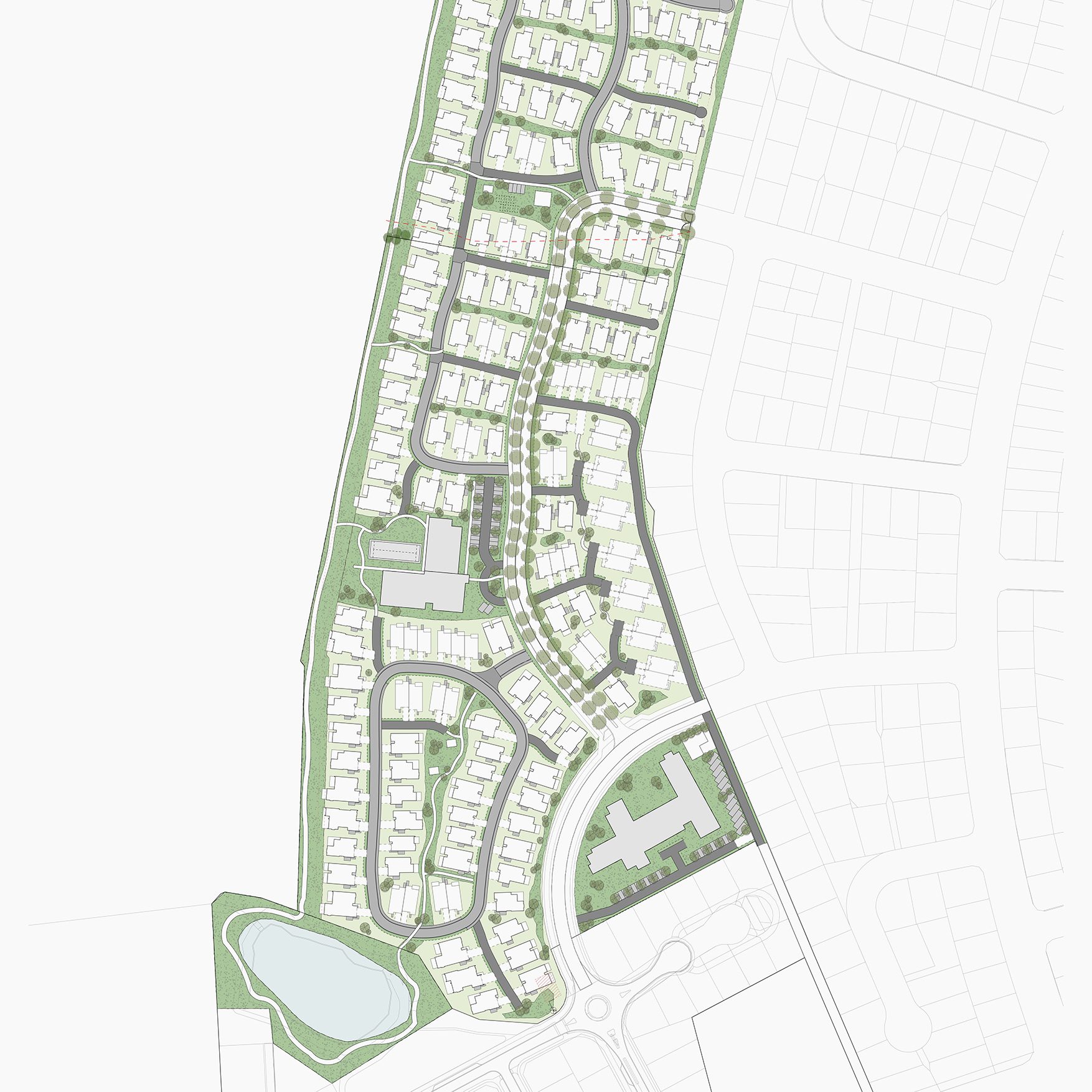 A key design driver has been the retention of its rural character. The masterplan is designed to have a legible structure with excellent onsite amenities, generous tree planting and a low-profile presence in the landscape.